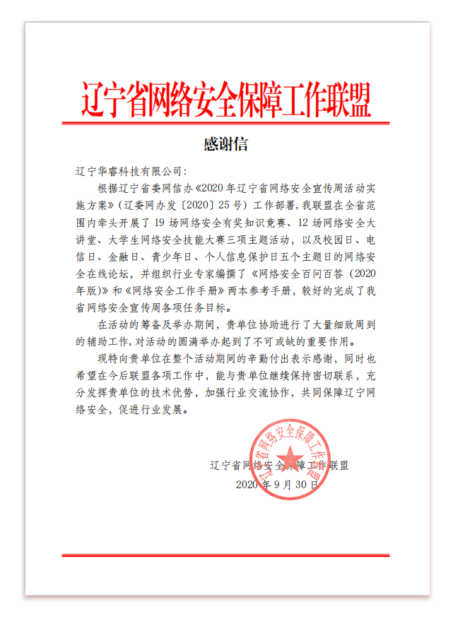 遼寧省網(wǎng)絡(luò )安全保障工作聯(lián)盟致——遼寧華??萍加邢薰尽案兄x信”。