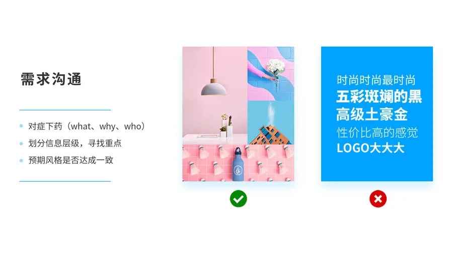 Ps:關(guān)于第3步風(fēng)格溝通,建議雙方用圖片交流和表達。畢竟每個(gè)人對“高大上”的理解都是不一樣的,有的人認為是五彩斑斕的黑,有人認為是大量的留白。