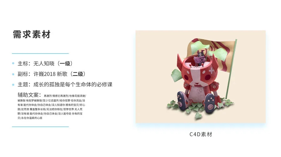 當我們的工作內容無(wú)法滿(mǎn)足做文字比較多的平面海報的欲望時(shí),可以考慮自命題的練習。當時(shí)聽(tīng)到許巍《無(wú)人知曉》這首新歌的時(shí)候,有一些感悟和想法然后做了一些C4d素材,想利用它作為主體和歌名做一下排版練習: