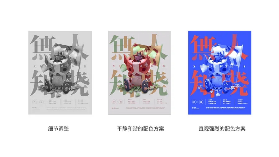 然后調整主體中4個(gè)字和素材之前的交叉和重疊,細節調整后,我嘗試了2個(gè)配色方案,一種是利用主體素材的顏色進(jìn)行搭配,平靜和諧;另外一種是紅藍配色,直觀(guān)強烈。