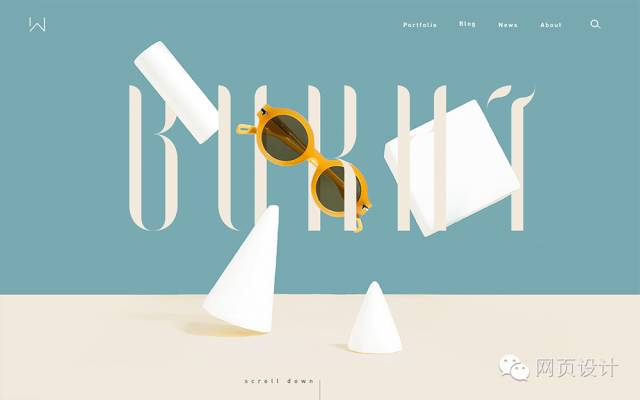 這個(gè)頁(yè)面設計中,字母與靜物交相融合的區域位于正中,成為虛焦點(diǎn),而利用色彩的對比,那副黃色眼鏡又從虛焦點(diǎn)的區域突出出來(lái)成為實(shí)焦點(diǎn)